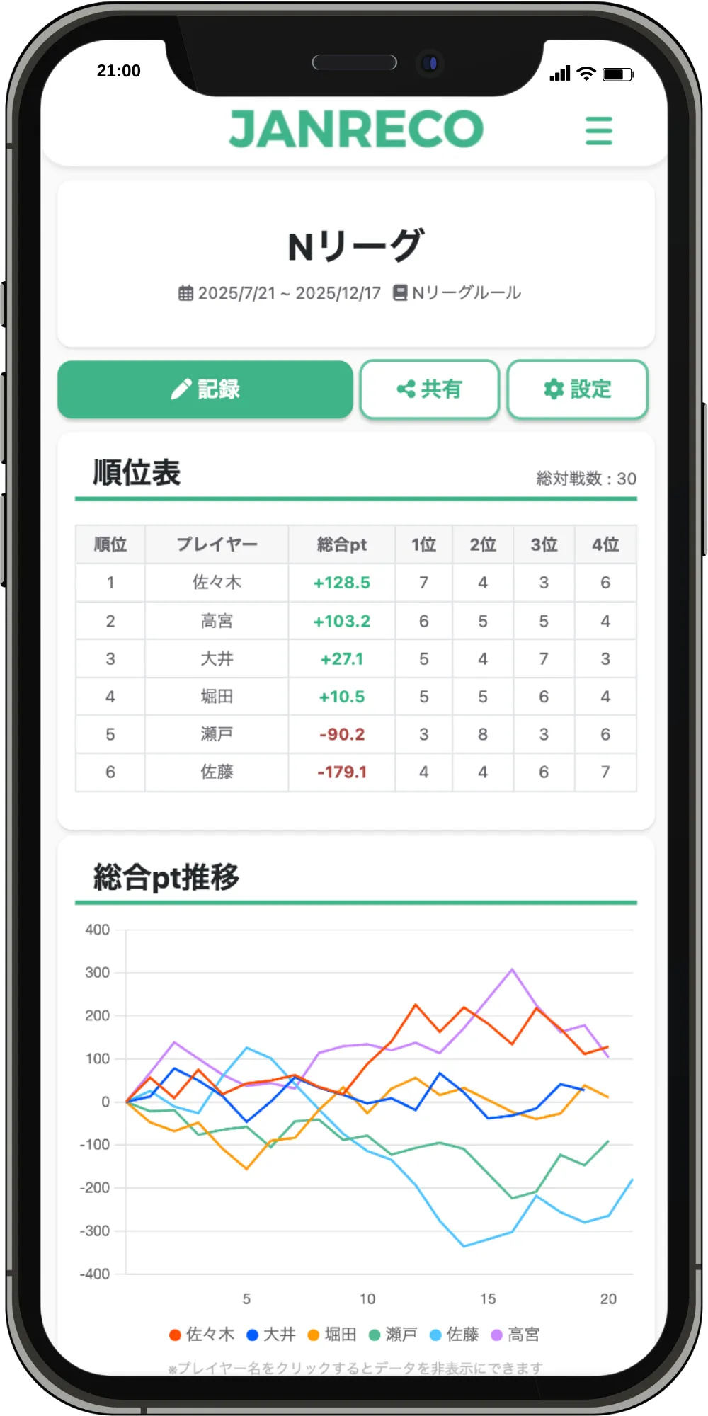 麻雀の成績管理に必要な機能を全て搭載。